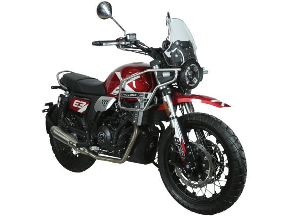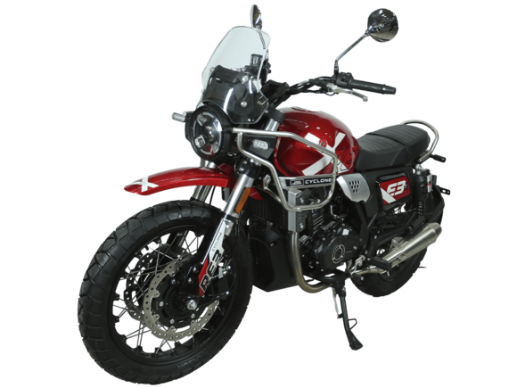 CYCLONE RE3 Scrambler (SR400-A) – универсальный мотоцикл, объединяющий в себе черты городского мотоцикла и эндуро. Управляя им, можно бросить вызов и городским пробкам, и скоростным автострадам, и всевозможному лёгкому бездорожью. Его дизайн отдаёт дань уважения каферейсерской тематике.Двухцилиндровый четырёхтактный двигатель объёмом 401 см3 выдаёт 43 л.с. на 9500 об/мин. Инжекторный впрыск топлива с инжектором BOSCH увеличивает топливную экономичность, а также позволяет добиться высокой приёмистости и неприхотливости агрегата. Жидкостная система охлаждения не допустит перегрева двигателя даже при самом агрессивном вождении. На мотоцикл установлена 6-ступенчатая механическая коробка передач.Максимальная скорость мотоцикла составляет 140 км/ч.Мотоцикл оснащён классическими спицованными колёсами диаметром 17 и 19 дюймов и имеет достаточно большой дорожный просвет – 22 см. С неровностями дороги эффективно справляются телескопическая вилка перевёрнутого типа спереди и маятник с двумя амортизаторами сзади. Ход передней подвески составляет 130 мм, задней – 81 мм. Оба компонента подвески являются регулируемыми. Эффективное и безопасное замедление с любых скоростей обеспечивают гидравлические дисковые тормоза с ABS спереди и сзади.Клиренс мотоцикла составляет 220 мм. Объём топливного бака – 19 л. Снаряжённая масса – 200 кг.На данной модели штатно установлены дуги безопасности, а также имеется бортовой компьютер с цветным дисплеем, USB-порт и подсветка пультов.RE3 Scrambler сочетает в себе отличные технические характеристики, комфорт и надёжность, что позволяет вам ощутить настоящую свободу на любой дороге с любым покрытием.