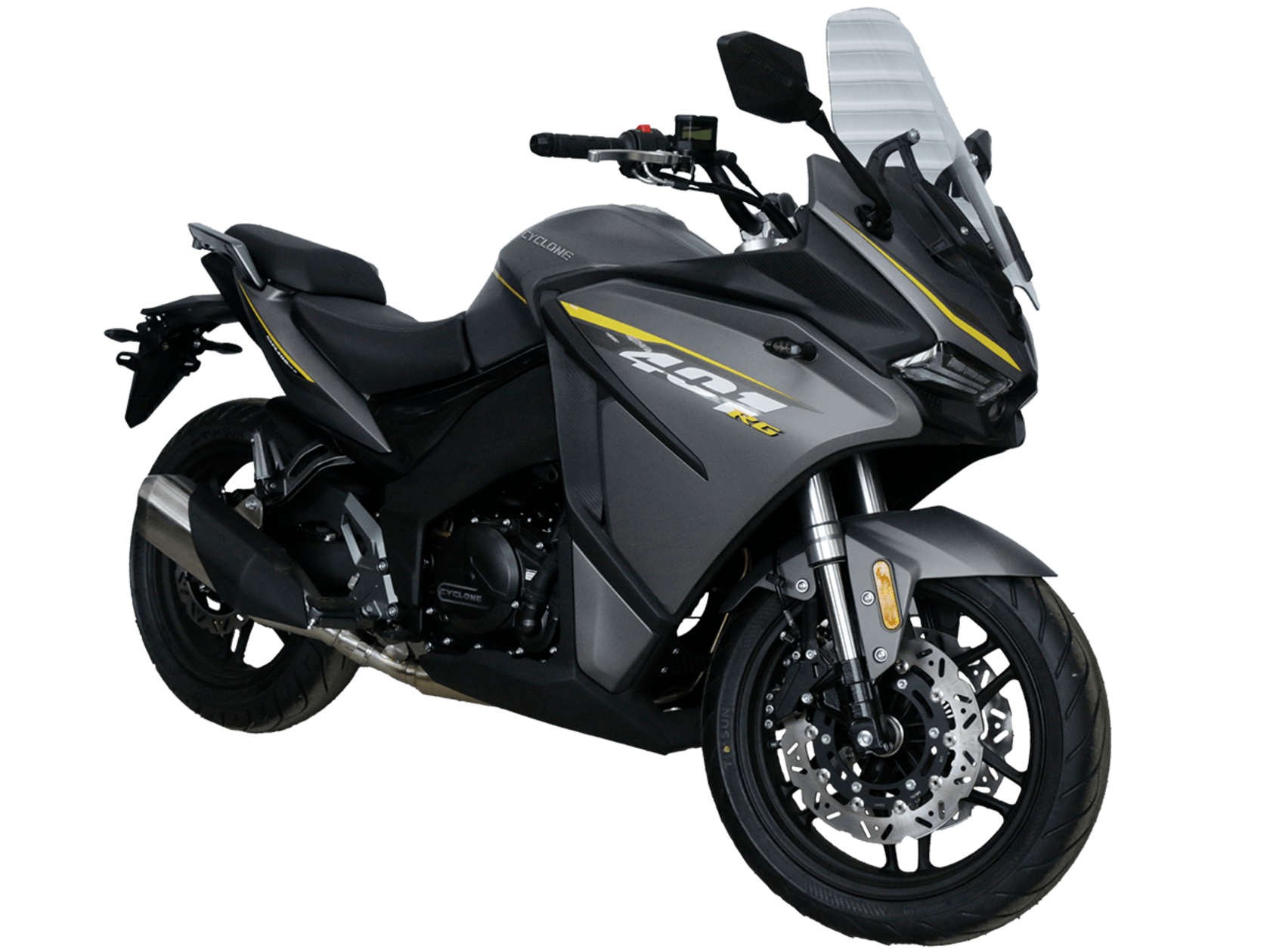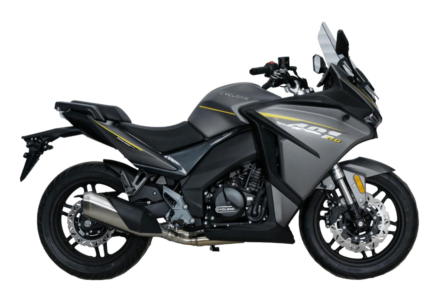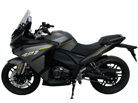 CYCLONE RG401 (SR400GS-B) – турист для покорения самых непростых и протяжённых маршрутов. Он обладает стремительным и современным дизайном в лучших “традициях жанра” туристических мотоциклов.Рядный двухцилиндровый четырёхтактный двигатель объёмом 401 см3 выдаёт 43 л.с. на 9500 об/мин. Максимальный крутящий момент достигается на 8000 об/мин и составляет 37 Н·м. Инжекторный впрыск топлива с блоком управления BOSCH увеличивает топливную экономичность, а также позволяет добиться высокой приёмистости и неприхотливости агрегата. Жидкостная система охлаждения не допустит перегрева двигателя а даже на самых непростых маршрутах. На мотоцикл установлена 6-ступенчатая механическая коробка передач.Максимальная скорость мотоцикла составляет 155 км/ч.RG401 оснащён литыми алюминиевыми дисками диаметром 17 дюймов. Колёса обуты в бескамерные покрышки TIMSUN. С неровностями дороги эффективно справляются телескопическая вилка перевёрнутого типа спереди и маятник с моноамортизатором сзади. Ход передней подвески составляет 120 мм, задней – 55 мм. Оба компонента подвески являются регулируемыми. Эффективное и безопасное замедление с любых скоростей обеспечивают гидравлические дисковые тормоза с двухканальной системой ABS спереди и сзади.Клиренс мотоцикла составляет 155 мм. Объём топливного бака – 21 л. Снаряжённая масса – 213 кг.Модель имеет два видеорегистратора, механическую регулировку ветрового стекла, датчики давления в шинах, подсветку пультов и два USB-порта. При желании можно оснастить мотоцикл двумя боковыми кофрами.Мотоцикл сочетает в себе отличные технические характеристики, комфорт и надёжность, что позволяет вам ощутить настоящую свободу на любой дороге.