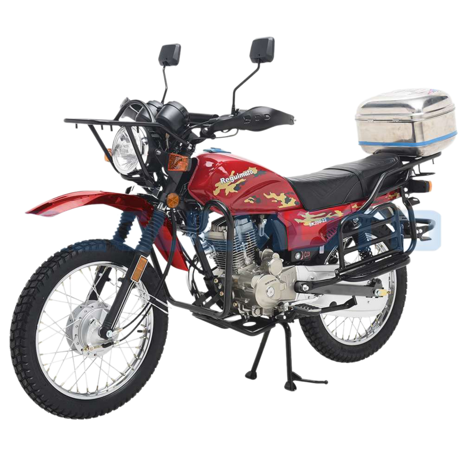Regulmoto SK200-22 – достойный представитель класса классических дорожных мотоциклов. Эта модель может быть использована в качестве надежного и экономичного средства передвижения по дорогам общего пользования и легкому бездорожью для решения широкого круга эксплуатационных задач.Данный мотоцикл разработан специалистами известной мотоциклетной компании SENKE и собирается на ее производственных мощностях. Благодаря высоким стандартам контроля качества продукция компании пользуется заслуженным признанием экспертов мотоиндустрии и поклонников двухколесного транспорта во многих странах мира.В раме Regulmoto SK200-22 устанавливается проверенный временем 4-тактный одноцилиндровый 200-«кубовый» двигатель с 5-ступенчатой коробкой передач и электростартером, работающий в паре с карбюратором. Средний расход топлива составляет меньше трех литров на сто километров пути. Подвеска представлена телескопической вилкой спереди и двумя амортизаторами сзади. Тормозная система мотоцикла базируется на классических барабанных тормозах в ступицах 18-дюйомвых колес.Мотоцикл в стоковой комплектации оснащается дугами безопасности, кожухом защиты цепи, защитой рук, защитой двигателя, центральной и боковой подножками. Откидные площадки под боковые кофры, передний и задний багажник с установленным на нем кофром позволят перевозить массу полезного груза – заявленная производителем грузоподъемность составляет 180 кг. Благодаря значительному клиренсу, высокому расположению крыльев, комплектации кофром и багажниками мотоцикл Regulmoto SK200-22 способен стать оптимальным выбором для поездок в лес, на рыбалку или охоту.