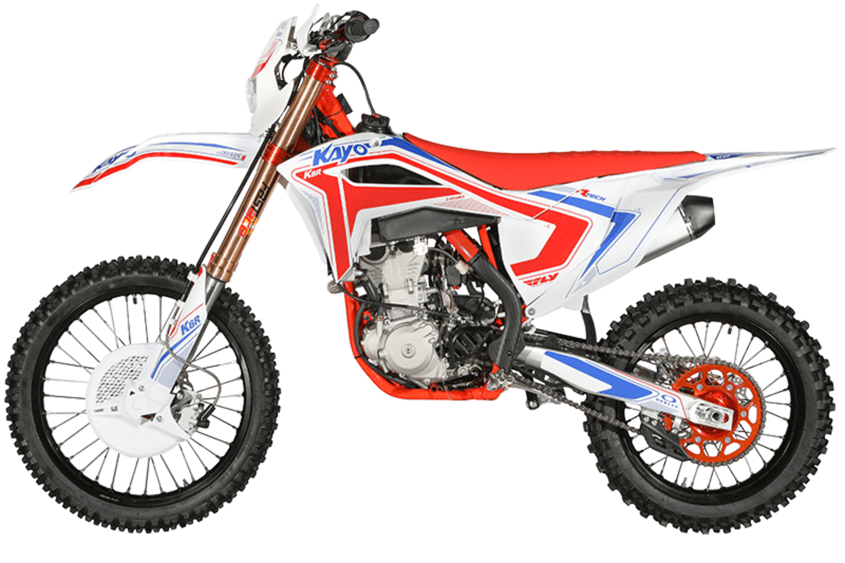 Мотоцикл KAYO K6 250 EFI 21/18 — полноразмерный эндуро для езды по бездорожью. Модель отличается выраженным спортивным характером и обеспечивает повышенную проходимость.Мотоцикл оснащён одноцилиндровым 4-тактным двигателем NC250S ZS177FMM-A с 4 клапанами и 2 распредвалами. При объёме 250 см³ двигатель способен обеспечить мощность в 30 л.с. Жидкостная система охлаждения собрана на 2 радиаторах с большой площадью и вентилятором, что позволяет эффективно поддерживать рабочую температуру даже в самых жёстких условиях. Инжекторная система питания EFI обеспечивает оптимальное смешивание топливной смеси, эффективную работу мотора и низкий расход топлива.Механическая коробка передач имеет 6 ступеней и схему 1-N-2-3-4-5-6.Объём топливного бака 7,5 литра.Классические спицованные колёса имеют диаметр 21 дюйм спереди и 18 дюймов сзади. Внедорожные покрышки с развитым протектором обеспечивают устойчивость на разных типах покрытий.На обновлённой модификации мотоцикла установлены высокопроизводительные амортизаторы KAYO Racing Performance. Подвеска располагает полным диапазоном настроек, позволяющих адаптироваться под разные эксплуатационные задачи. Длина переднего амортизатора 950 мм, длина заднего амортизатора 480 мм.В основу модернизированной тормозной системы легла конструкция от NISSIN и собственные доработки KAYO. Спереди используется 2-поршневой гидравлический суппорт, тормозной диск диаметром 270 мм и рычаг тормоза CNC 360 Pro Caken. Сзади установлен однопоршневой гидравлический суппорт и тормозной диск 240 мм.Оснащён фарой, что позволяет устраивать заезды в тёмное время суток. Имеется защита рук и защитный кожух для переднего тормозного диска.Удобная рама с грамотной развесовкой добавляет комфорта при езде и очень удобна для пилотирования в стойке. Габариты мотоцикла 2180х820х1254 мм, вес 114 кг. Колёсная база 1488 мм. Высота по седлу 950 мм.