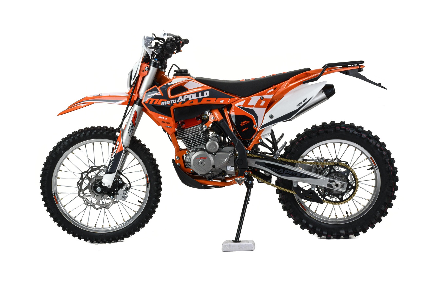 Мотоцикл Кросс Moto Apollo M3 300 это кроссовый мотоцикл нового поколения. Имеет отличную проходимость и тяговую мощность за счет установленного двигателя ZONGSHEN 175FMM на 4 клапана, мощностью 28 л.с. ,и карбюратором NIBBI PE 30. Разгоняется до 145 км/ч. Выхлопная система с резонатором "AKRAPOVIC" совместно с системой POWER BOMB, которая увеличивает мощность на низких оборотах.и улучшает дожигание топливной смеси, что ведет за собой экономию топлива на средних оборотах.Идеален для бездорожья, т. к. его кроссовые шины (110-100) и (80-100) просто созданы для езды по мягкому и среднему грунту. Телескопическая вилка перевернутого типа c регулировкой позволяет легко преодолевать ямы, ухабы и другие неровности. Задняя подвеска маятниковая, с моноамортизатором.Его дерзкий дизайн подчёркивает неуступчивый спортивный характер байка.Мотоцикл Кросс Moto Apollo M3 300 весит 120 кг, выдерживает нагрузку до 150 кг. Прочный облицовочный пластик не ломается при сгибании, защищает от грязи. Надёжно закрепленный руль имеет переменное сечение: 28 мм в месте крепления и 22 мм на концах под грипсами, а также короткоходную ручку газа. На мотоцикле установлены складные рычаги с защитой рук. Колёса на алюминиевых хромированных ободах, оснащены усиленными спицами и антибуксаторами, размер заднего колеса — 18 дюймов (110-100), переднего — 21 дюйм (80-100)