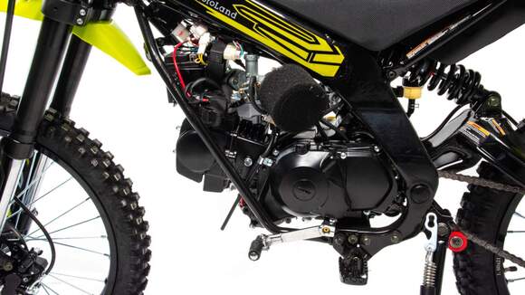 Трейлбайк MotoLand Jumper 125 – малокубатурный аппарат для покорения бездорожья, лучший выбор для исследования пересеченной местности и окрестностей загородного дома или дачи.В стальной трубчатой раме трейлбайка Jumper установлен 1-цилиндровый 4-тактный двигатель с 2-клапанной головкой, рабочим объемом в 125 см3. Модель 2022 г оснащена электростартером.Мотор работает в паре с карбюратором Keihen PZ 26; такая конфигурация позволяет демонстрировать 7,5 «лошадей» максимальной мощности при 8000 об/мин. Показатели максимального крутящего момента составляют 8,5 H.m при 5000 об/мин.Байк комплектуется колесами диаметром 21 дюйм с легкими дисками. Колеса оснащены антибуксаторами. Штатная подвеска, представленная нерегулируемыми вилкой-перевертышем спереди и пружинным амортизатором сзади, опционально может быть заменена топовыми амортизаторами с регулировками, производства компании FASTACE. В комплект входит алюминиевый руль переменного сечения диаметром 28 миллиметров, цепкие подножки, армированные шланги.