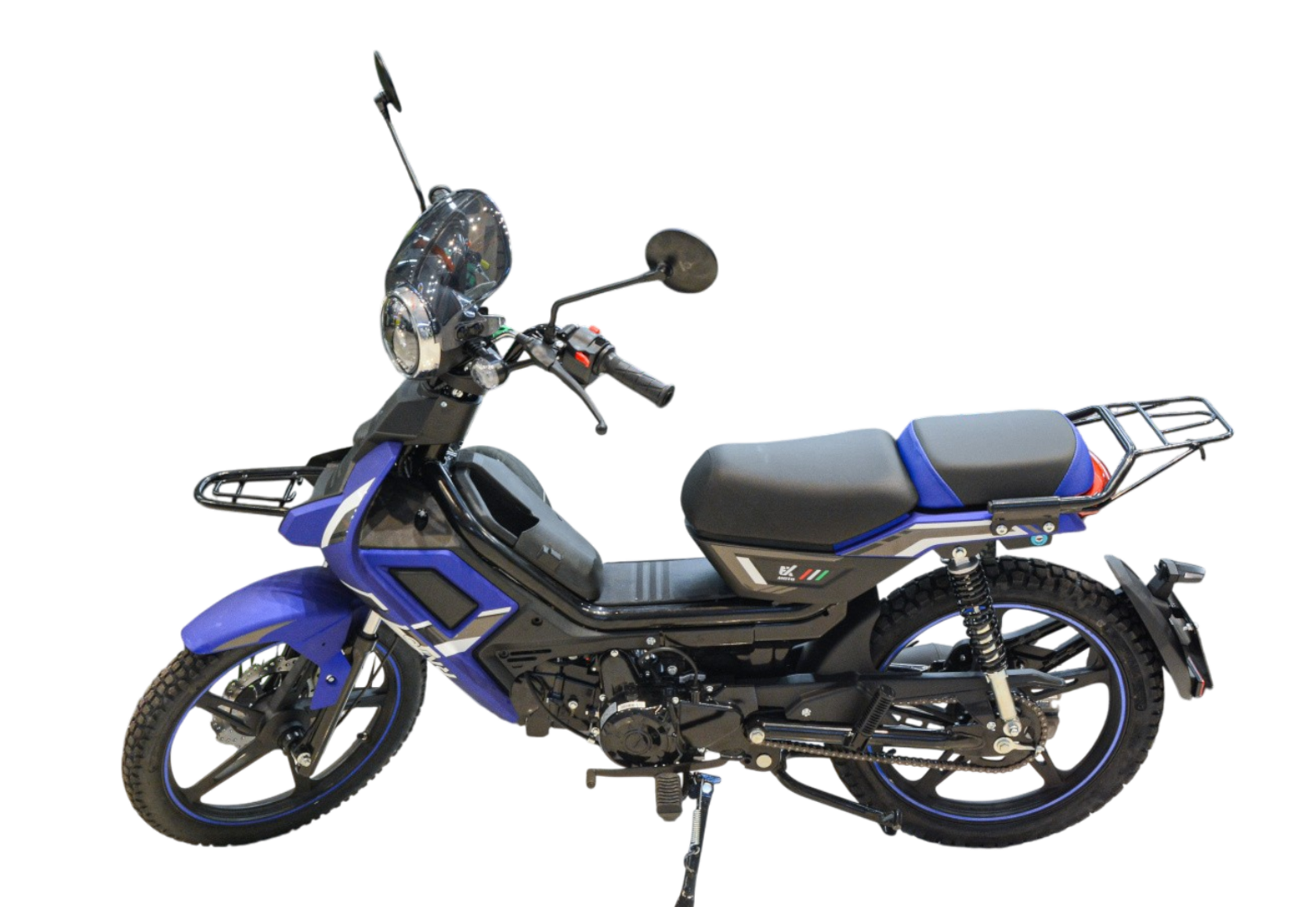 Мопед FXMOTO FX-50 — это идеальное сочетание современного дизайна, надежности и комфорта. Этот компактный транспорт создан для тех, кто ценит удобство в повседневной жизни и любит выезжать за город на природу. С его мощным двигателем объемом 125 куб. см (на базе ДВС 50 куб. см) и воздушным охлаждением, он легко справляется как с городскими улицами, так и с легким бездорожьем.Одним из главных преимуществ FXMOTO FX-50 является его современная оптика. Полностью диодная фара головного света, светодиодные задние фонари и поворотники обеспечивают отличную видимость в любое время суток, а также делают мопед заметным на дороге. Ветровое стекло защищает от ветра и грязи, делая каждую поездку более комфортной.Модель оснащена увеличенным топливным баком, что позволяет реже останавливаться для заправки и наслаждаться длительными поездками. Для дополнительного удобства предусмотрен USB-разъем, который позволит заряжать ваши гаджеты прямо в пути. Кофр и дополнительные карманы на передней дуге помогут организовать пространство для хранения вещей, будь то покупки, инструменты или личные принадлежности.Дизайн FXMOTO FX-50 поражает своей современностью и функциональностью. Новые диски и обновленное переднее крыло не только улучшают внешний вид, но и обеспечивают лучшую защиту от грязи. Цветовая гамма включает пять вариантов: классический черный, яркий красный, глубокий синий, спокойный белый и уникальный оттенок морской волны. Каждый найдет цвет, который подчеркнет его индивидуальность.Безопасность всегда на первом месте. Мопед оснащен дисковым передним тормозом и барабанным задним, что гарантирует надежное торможение даже в сложных условиях. Современный электромеханический щиток приборов предоставляет всю необходимую информацию о состоянии мопеда, а шины размером 2,50/17 (передняя) и 2,75/17 (задняя) обеспечивают отличное сцепление с дорогой.FXMOTO FX-50 — это не просто мопед, это ваш надежный спутник в любой ситуации. Будь то ежедневные поездки на работу, учебу или отдых за городом, этот мопед справится с любой задачей. Его компактность, маневренность и экономичность делают его идеальным выбором для современного человека.