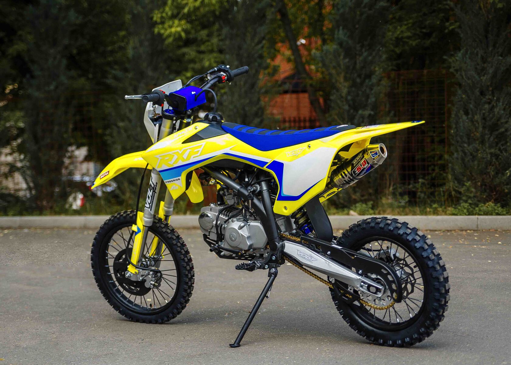 Представляем Вам обновленный RXF Freeride 125 LE 17/14. Модель обзавелась фарой, электростартером и также получила обновленный дизайн графики.RXF Freeride 140 L – по праву считается отличным выбором из линейки Freeride. Мотор YX 125 с электростартером достаточно мощный и тяговитый, чтобы не дать скучать опытным райдерам, но в тоже время достаточно покладистый и безопасный для новичков. На обновленном Freeride теперь есть фара головного света, которая идет в комплекте с питбайком.