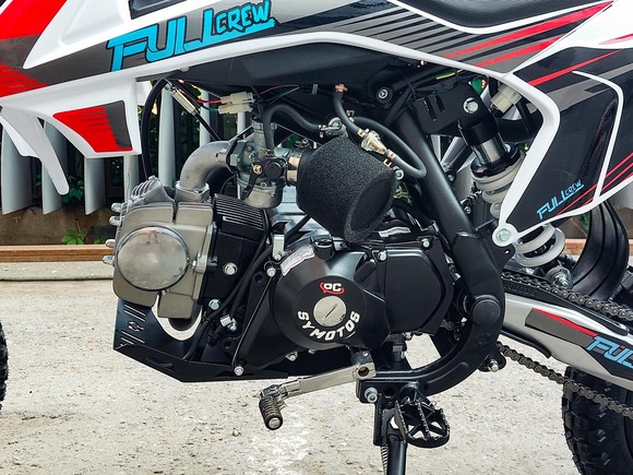 Питбайк Full Crew FC125e отлично подходит для пробующих мотоспорт – резвый мотор на 125 кубов с 9 лошадиными силами прекрасно работает с механической коробкой. Охлаждение воздушное – простая конструкция облегчает ремонт и удешевляет обслуживание. Для начинающих эта модель особенно интересна еще и из-за цены – можно основам научиться на нем с перспективой пересесть в дальнейшем на что-то более серьезное.Рама стальная усиленная, конструкция обеспечивает высокую удобную посадку, а подвеска (передняя перевернутая вилка и задний моноамортизатор) обеспечивает мягкое движение по кочкам, оврагам, деревьям и прочим всевозможным преградам на дикой трассе. Гидравлические тормоза работают надежно и четко.Из дополнительных приятных «плюшек»:- рычаги сцепления и тормоза откидываются;